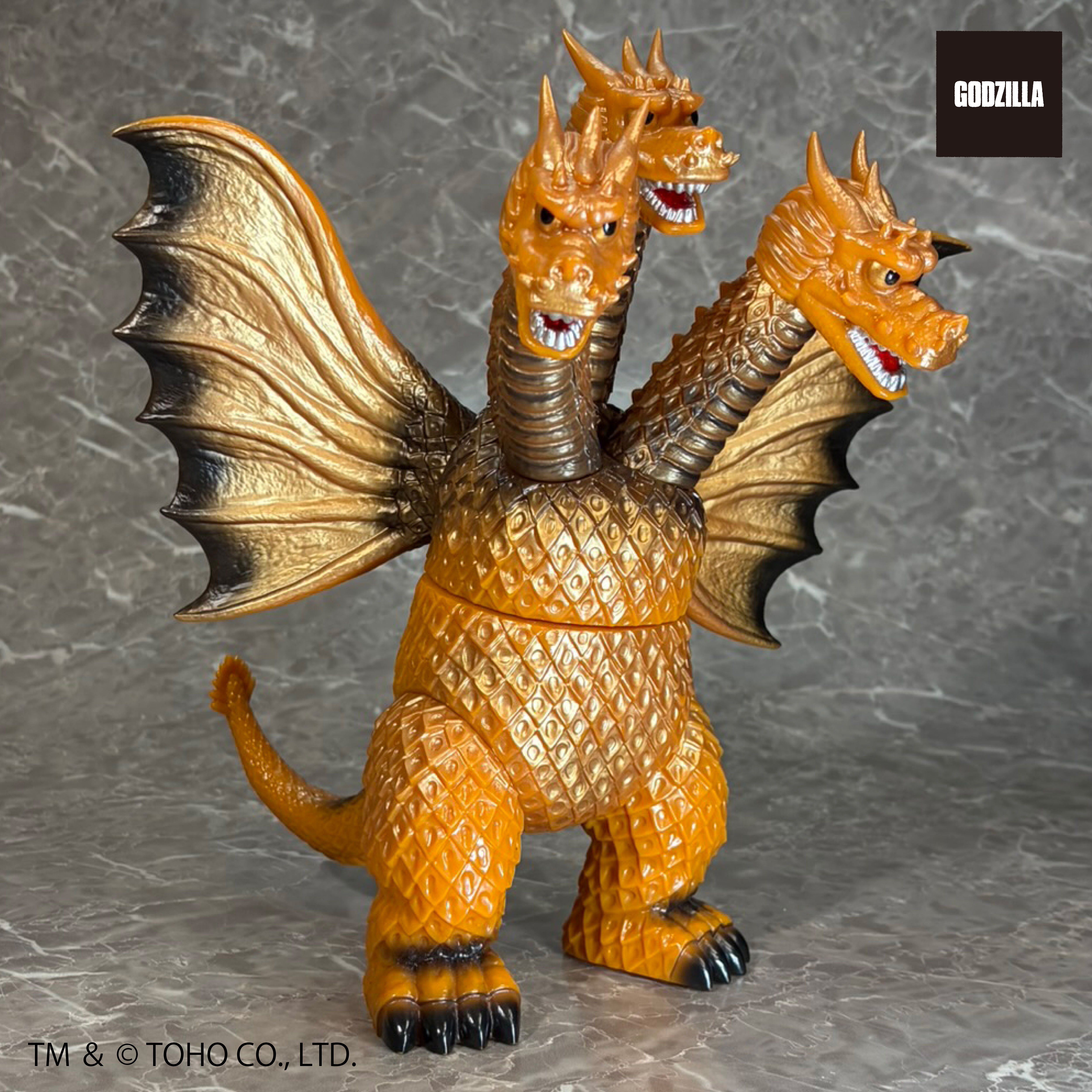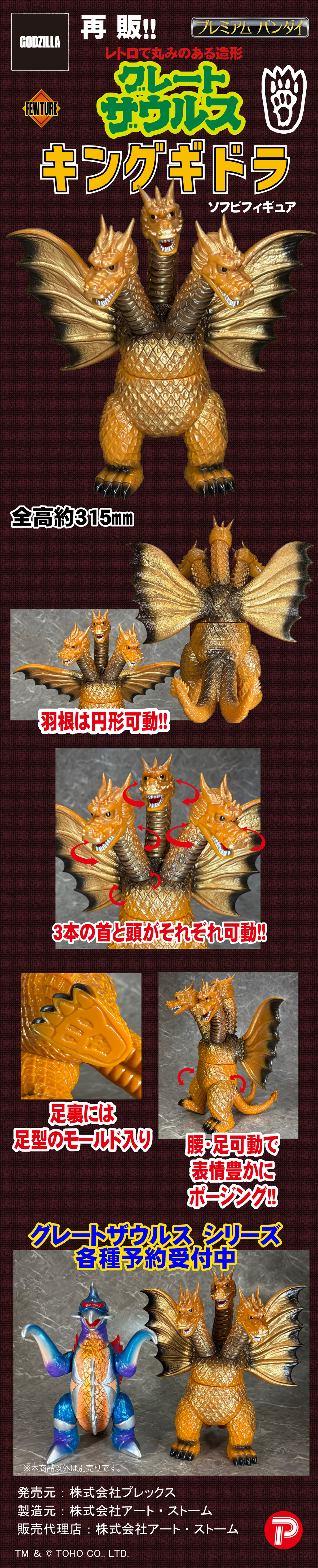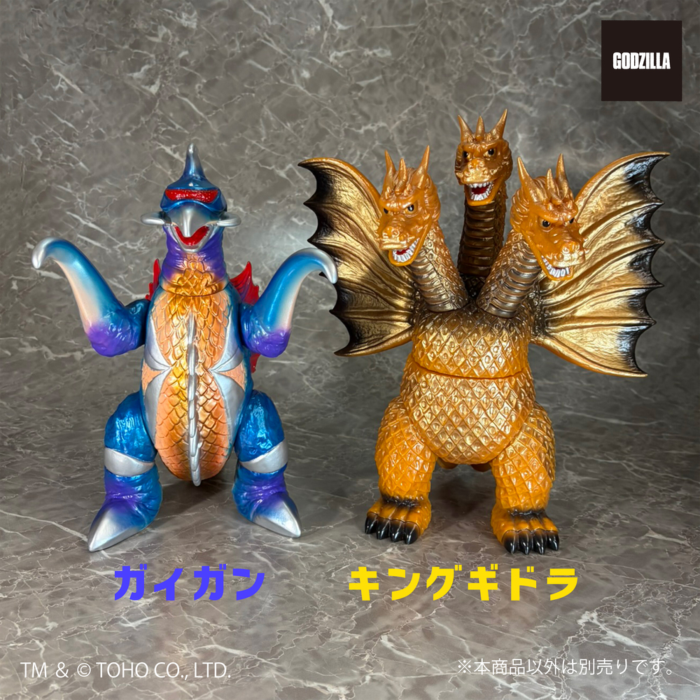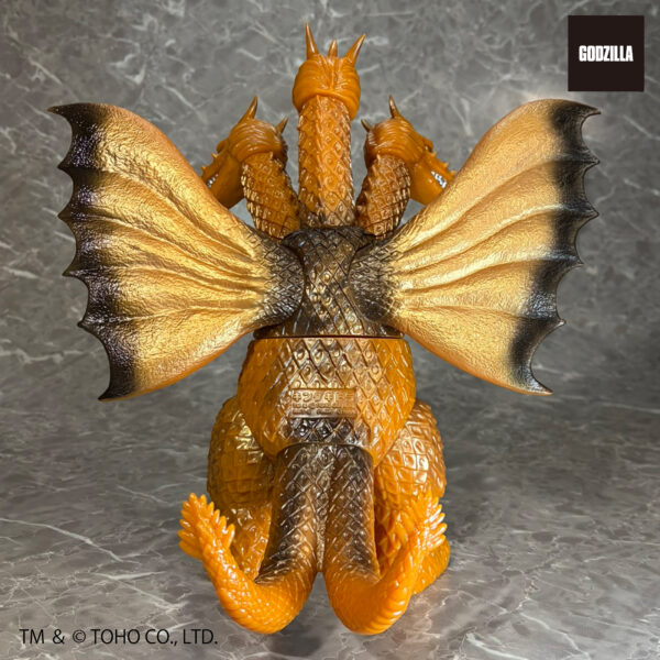 同シリーズとして、今回は3つの頭部と3本の首、2本の長い尾、全身を覆う黄金色の鱗、太い2本の足に加え、飛行に用いる巨大な1対の翼を持つキングギドラを、キングザウルスシリーズで発売されていたレトロな丸みのある造形フォルムにて新規造形。グレートザウルスシリーズのサイズで立体化!