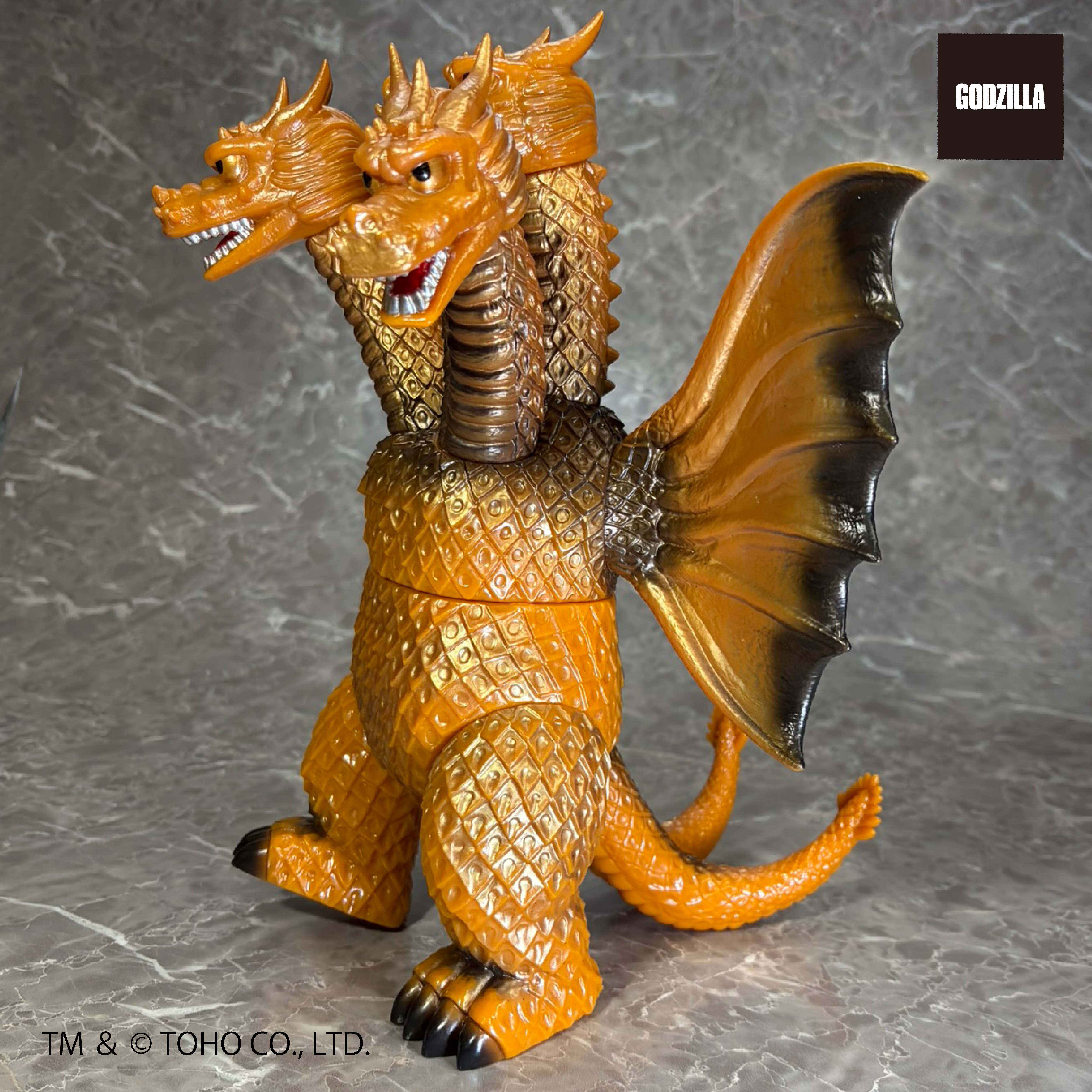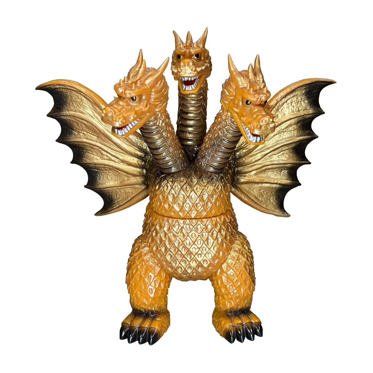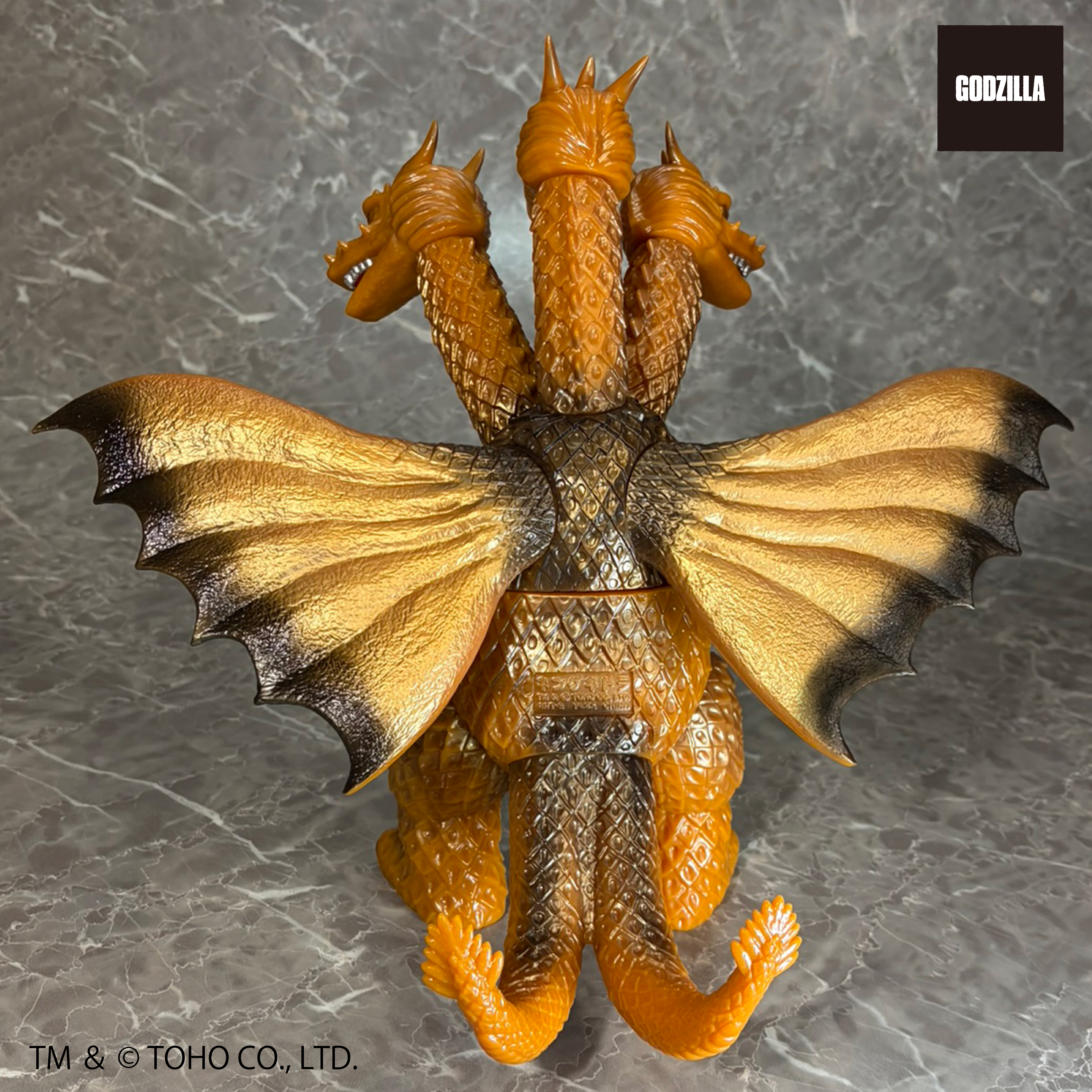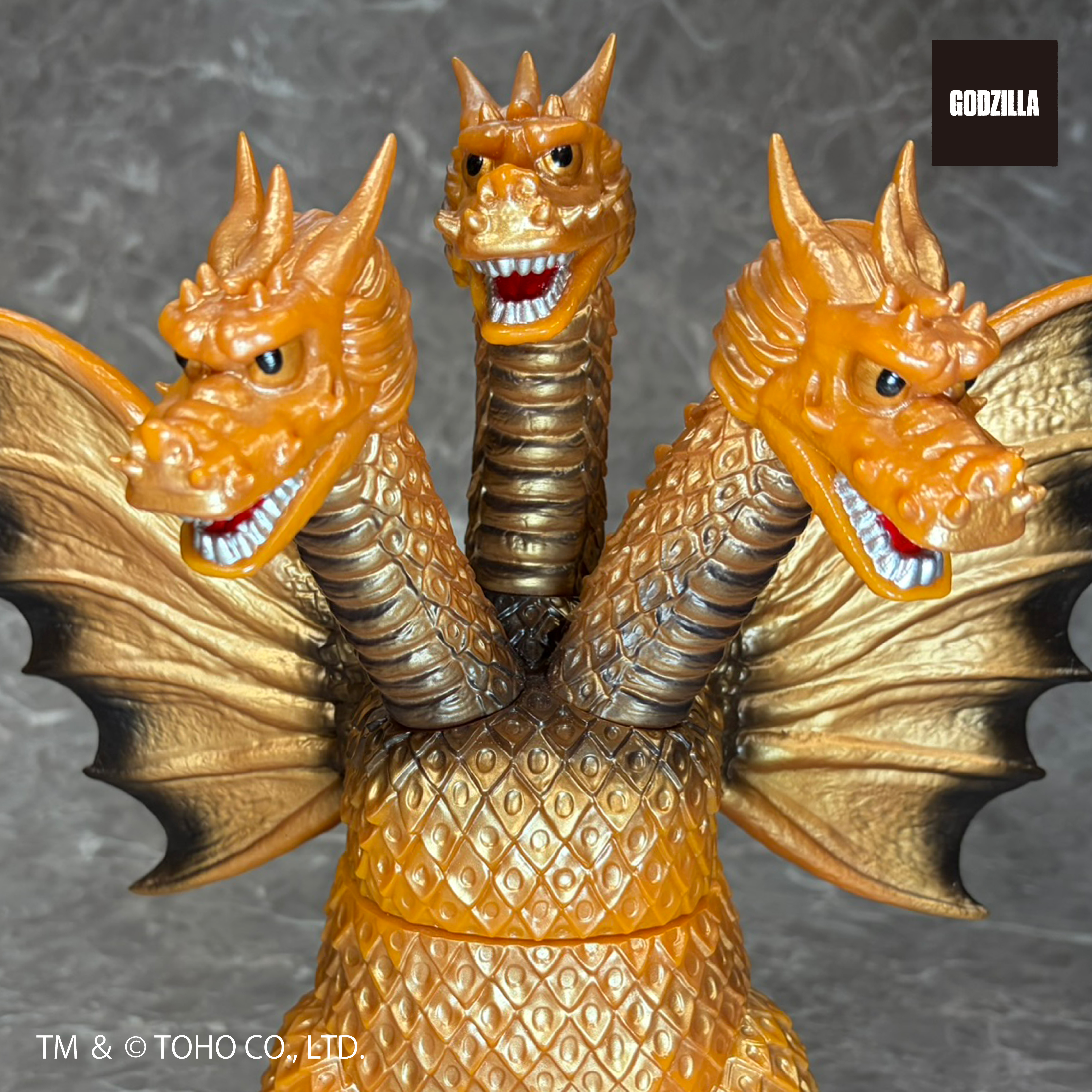 同シリーズとして、今回は3つの頭部と3本の首、2本の長い尾、全身を覆う黄金色の鱗、太い2本の足に加え、飛行に用いる巨大な1対の翼を持つキングギドラを、キングザウルスシリーズで発売されていたレトロな丸みのある造形フォルムにて新規造形。グレートザウルスシリーズのサイズで立体化!