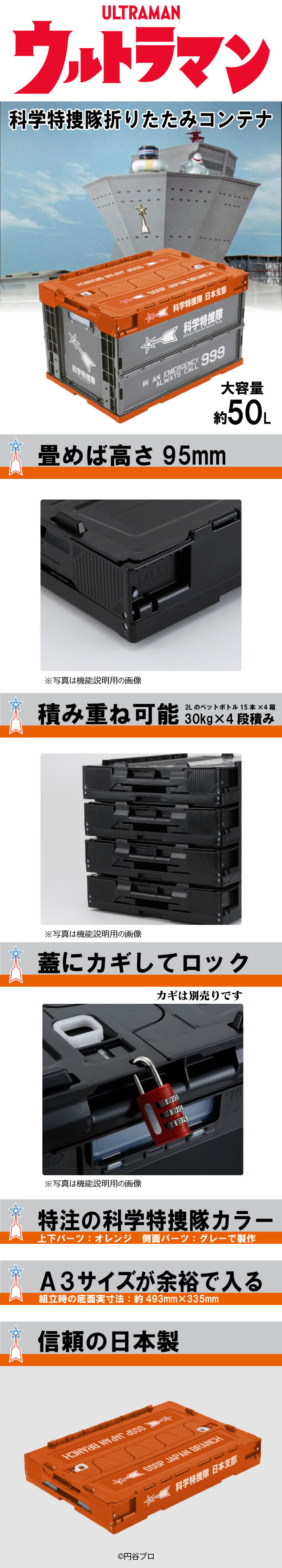 「ウルトラマン」から「科学特捜隊」の備品をイメージした折りたたみコンテナが登場! A3サイズも余裕で入る約50Lの大容量。底面実寸493mm×335mmでA3サイズが収納可能です。 大切なグッズや書籍など収納可能! 開閉ロック機能搭載。外部からのホコリ侵入、内容物の飛び出し防止加工が施されています。 畳めば高さ95mm 折りたたみ、積み重ねも可能なので使用しないときの保管にも場所を取りません。