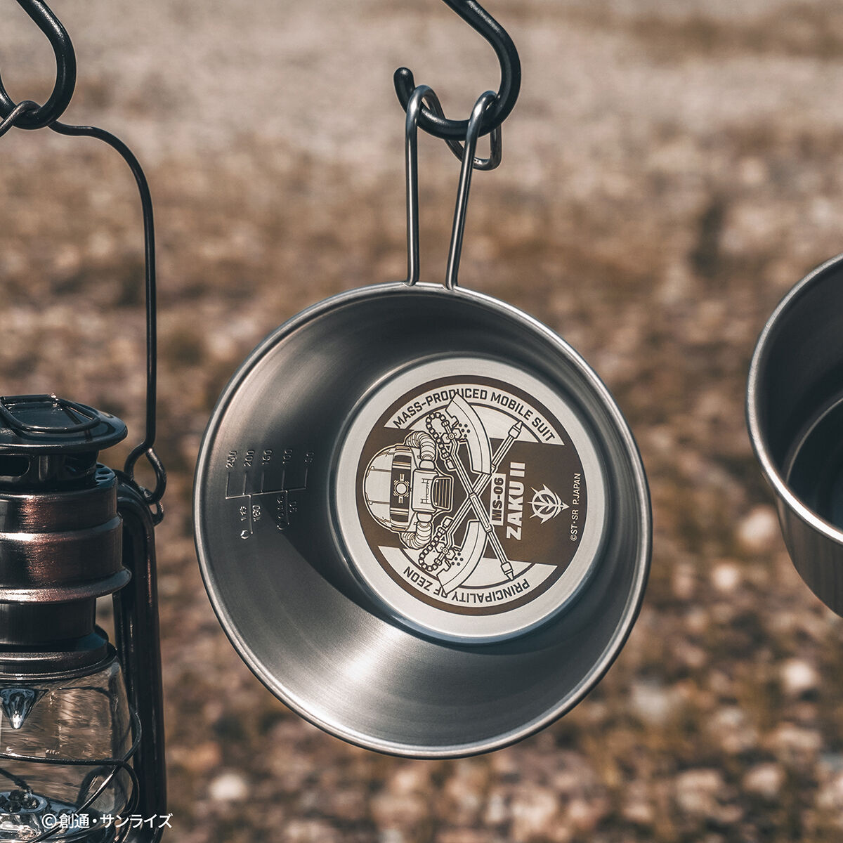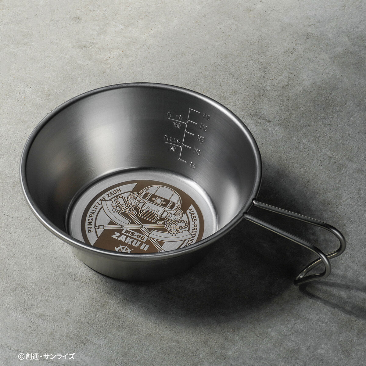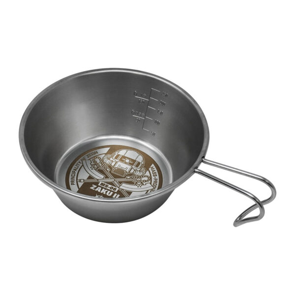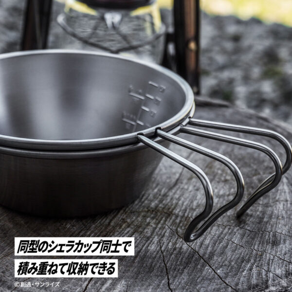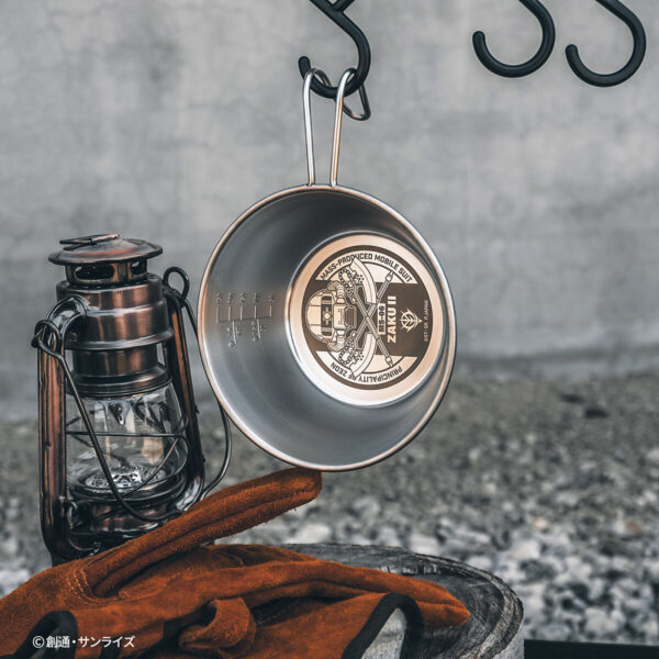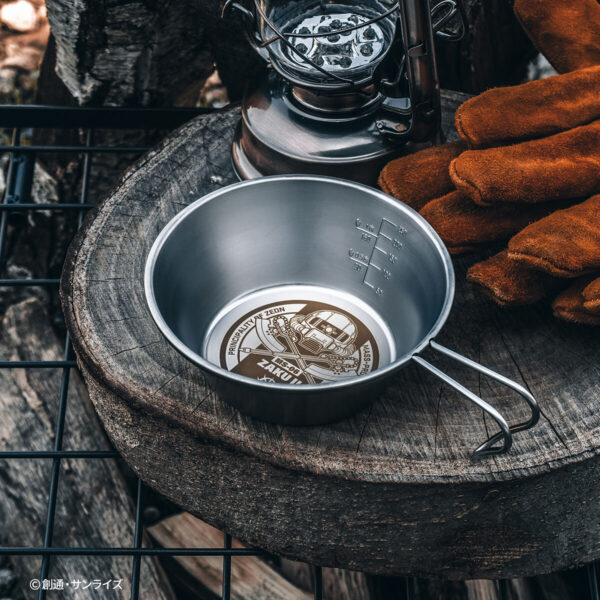 『機動戦士ガンダム』に登場する「ザクⅡ」をモチーフにしたデザインが刻印されたステンレス製のシェラカップ。ドリンクや料理を注ぐ器として使える広口のカップで、火にかけることができるので沸かす・焼く・煮るといった調理にも使用できる便利なアイテムです。