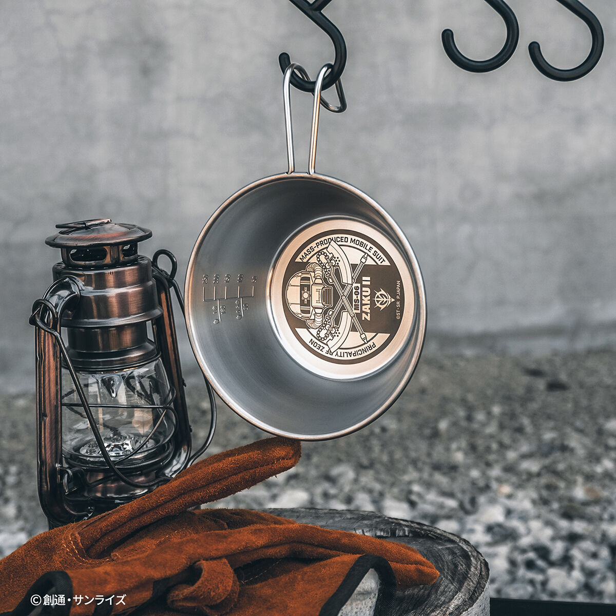 - ザクⅡが刻まれたキャンプギアを野外に持ち出せば、まるで一兵士として野営をしているような雰囲気を味わえます。