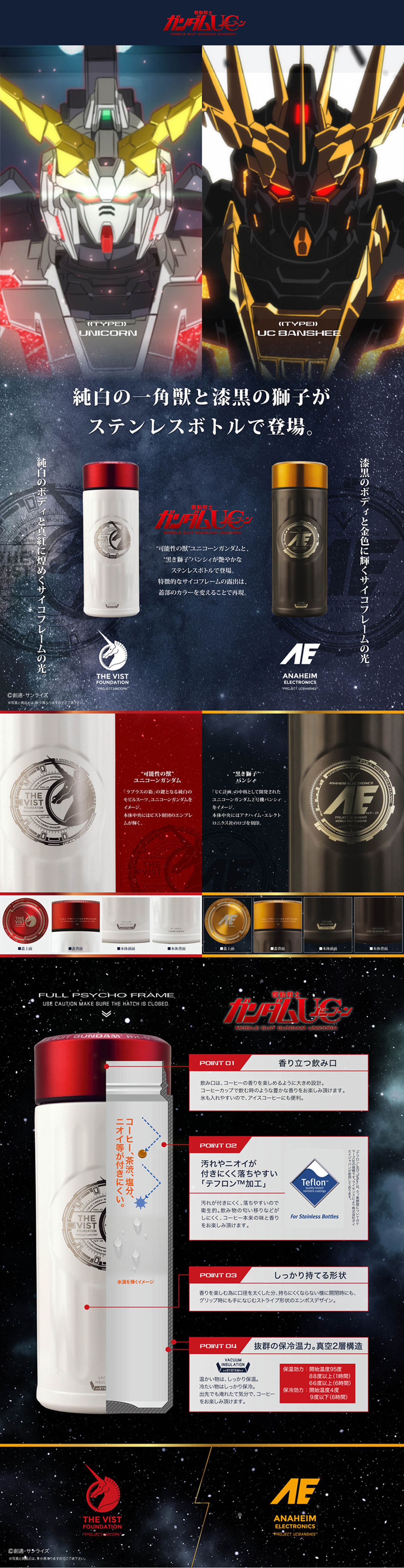 機動戦士ガンダムUCより、ユニコーンガンダムと2号機バンシィをモチーフにした『コーヒー専用ボトル』が登場!汚れやニオイが付きにくく落ちやすい「テフロン™加工」が施され、コーヒーに最適なステンレスボトルです。真空2層構造で、出先でも湧き立たての気分でコーヒーをお楽しみいただけます。両機のサイコフレームを再現したツートンカラー!ボディにはビスト財団とアナハイム・エレクトロニクス社のロゴマークを、1点1点レーザー刻印で施し、オフィスでも使いやすいデザインに仕上げました。 【セット内容】 【商品素材】 【商品サイズ】 【対象年齢】 【生産エリア】 |