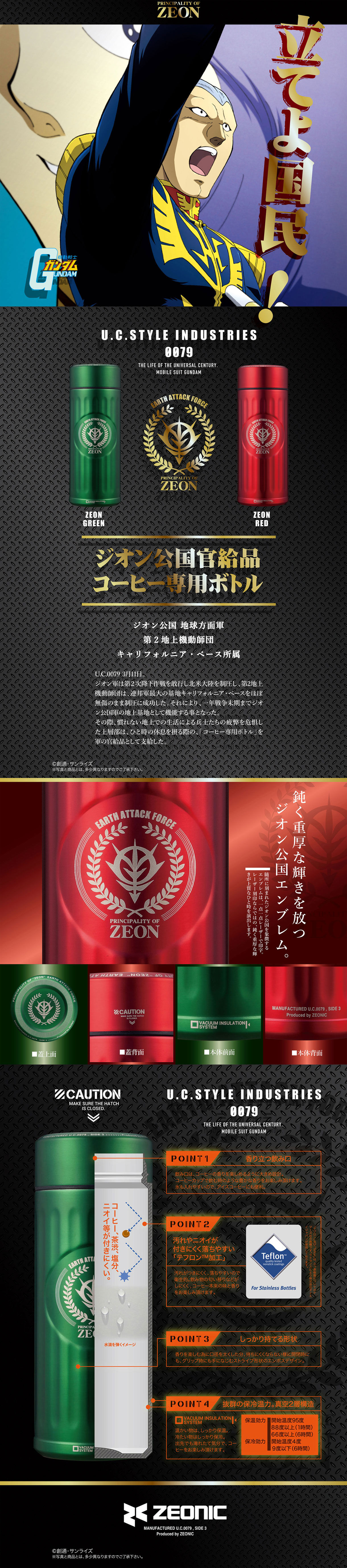 ジオン公国地球方面軍の備品をイメージしたアウトドアシリーズ『U.C.STYLE INDUSTRIES』より、コーヒー専用ステンレスボトルが登場!汚れやニオイが付きにくく落ちやすい「テフロン™加工」が施され、コーヒーに最適なボトルです。真空2層構造で、出先でも湧き立たの気分でコーヒーをお楽しみいただけます。