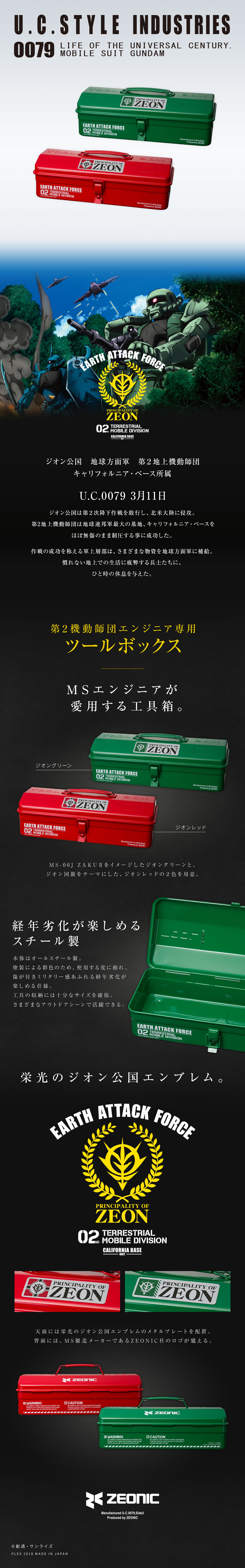 ジオン公国地球方面軍の備品をイメージしたアウトドアシリーズ『U.C.STYLE INDUSTRIES』より、キャリフォルニア・ベース基地のメカニック達が使用した、ツールボックスが登場!ザク2のイメージカラー「ジオングリーン」と、ジオン公国旗をイメージした「ジオンレッド」の2色。ボディはハウス形状のスチール製で、使い込むごとに経年劣化が楽しめる塗装仕上げです。アウトドアツールの収納はもちろん、ガレージやDIYでも活躍する逸品です。 【セット内容】 【商品素材】 【商品サイズ】 【重さ】 【対象年齢】 【生産国】 |