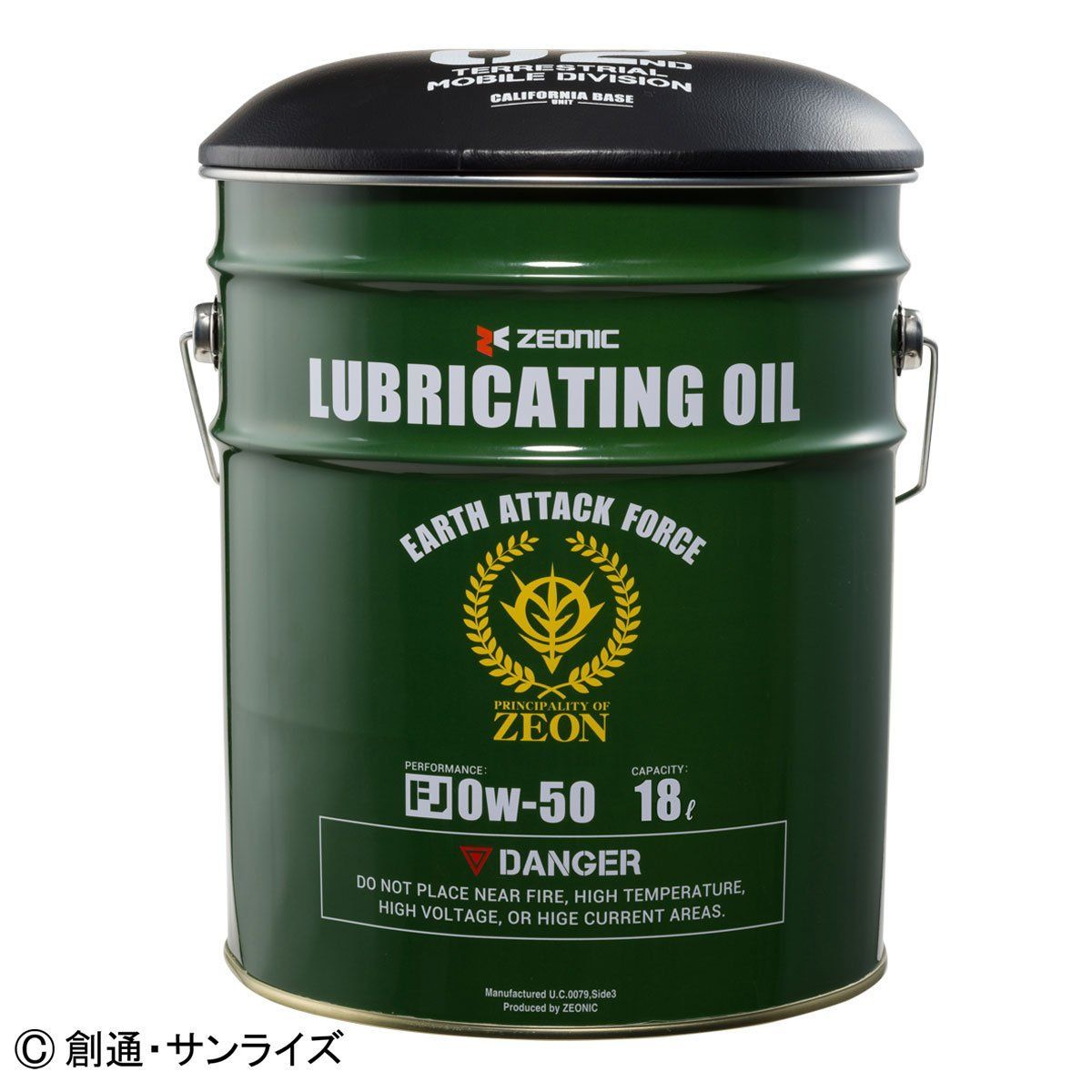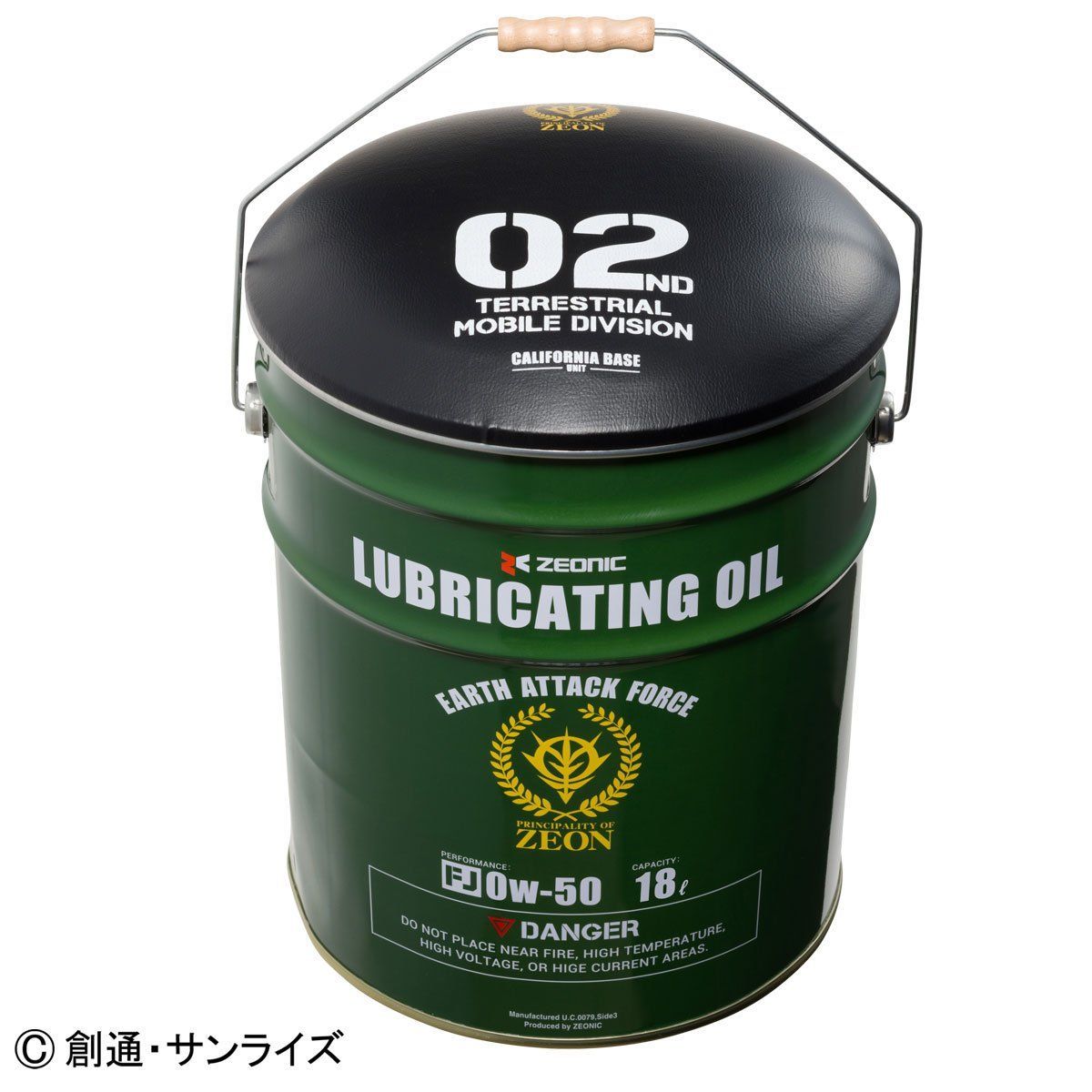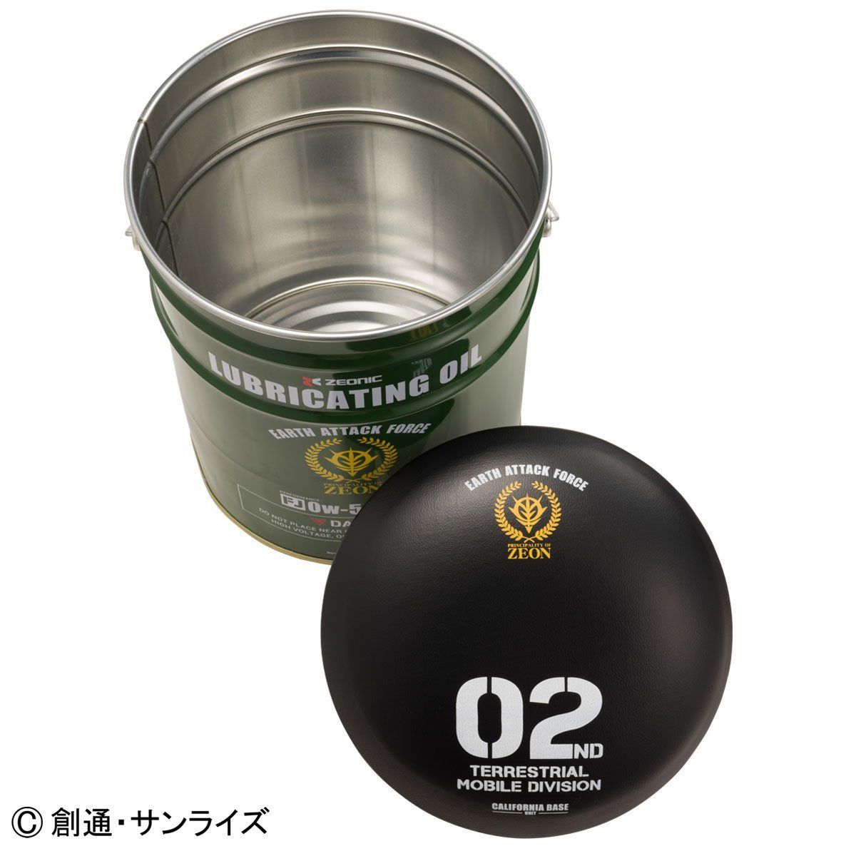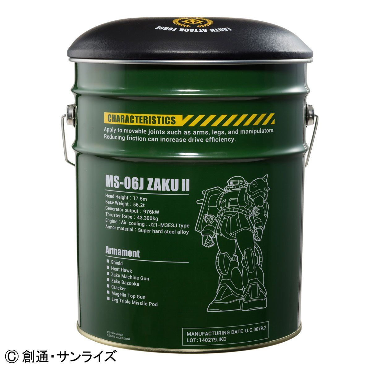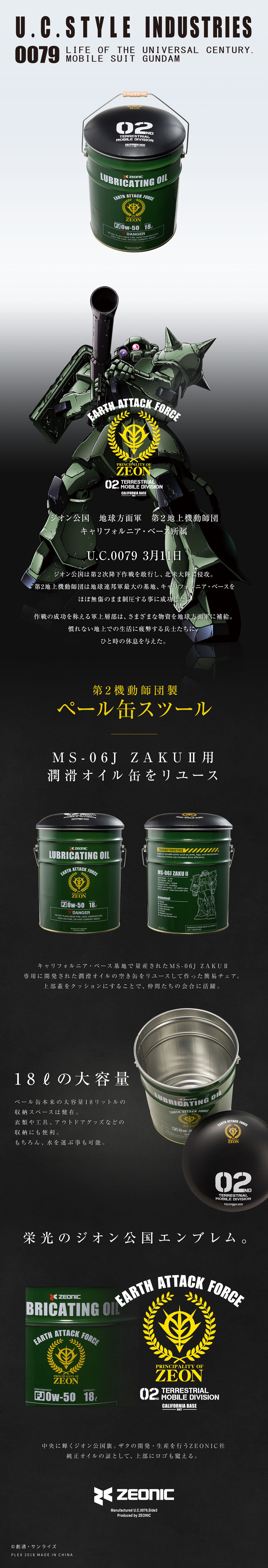 ジオン公国地球方面軍の備品をイメージしたアウトドアシリーズ『U.C.STYLE INDUSTRIES』より、MS-06J ザク2の潤滑オイルの缶をイメージした、ペール缶スツールが登場。キャリフォルニア・ベース基地で量産されたとされる陸戦型ザク2の関節・可動部分に塗布するオイルをZEONIC社が製造し地球に供給。現地のメカニック達が蓋をシートに改造したという設定。18リットルの大容量な収納スペースは、アウトドアでもインドアでも活躍できる逸品です。