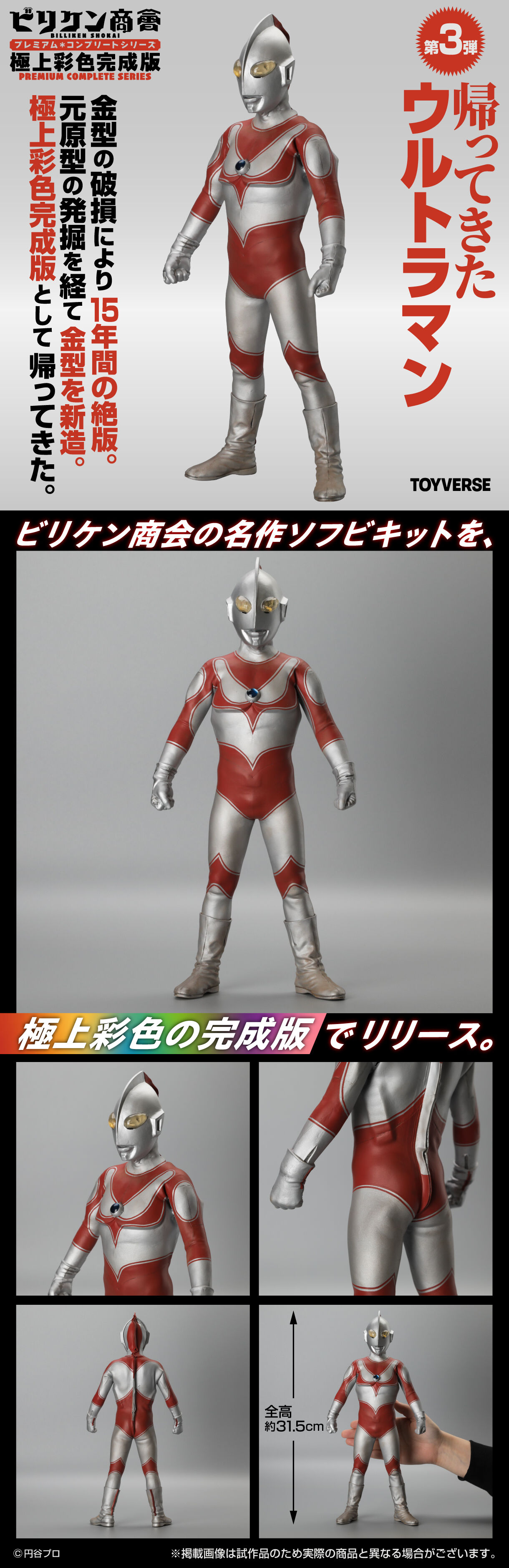 2005年にビリケン商会で発売された「帰ってきたウルトラマン」のソフビキットは、そのクオリティから高い評価を得ていたが、2011年に金型が破損したことにより、15年間再販がされていなかった幻の商品。