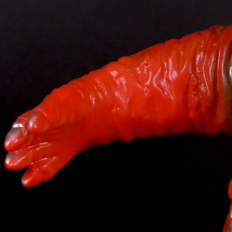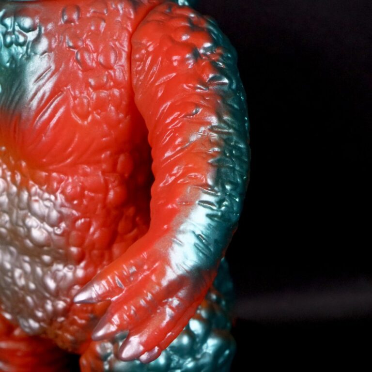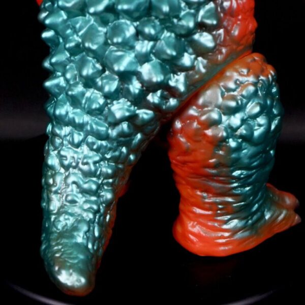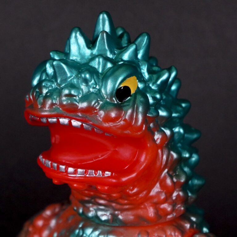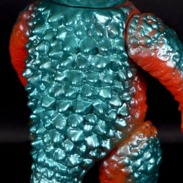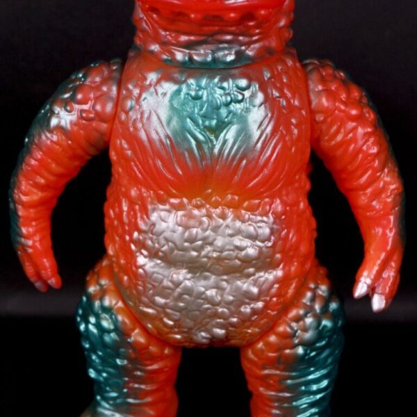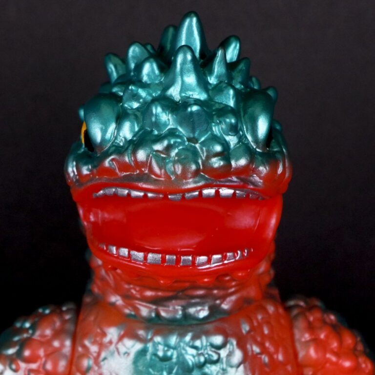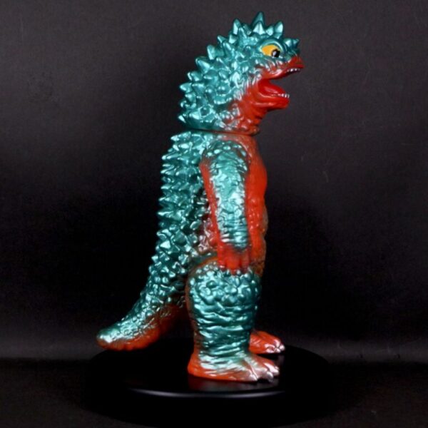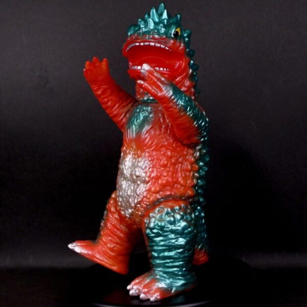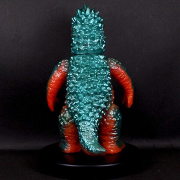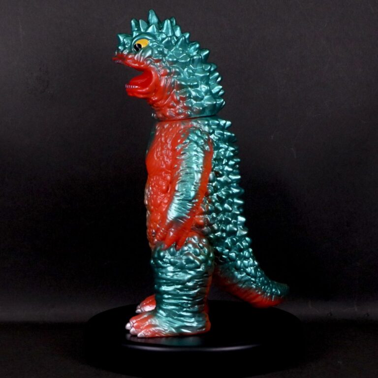 撮影用スーツが東宝怪獣『バラゴン』の流用であることを踏まえ、昭和のバラゴンソフビを思わせる色味でまとめた通好みな仕様を楽しんでほしい。