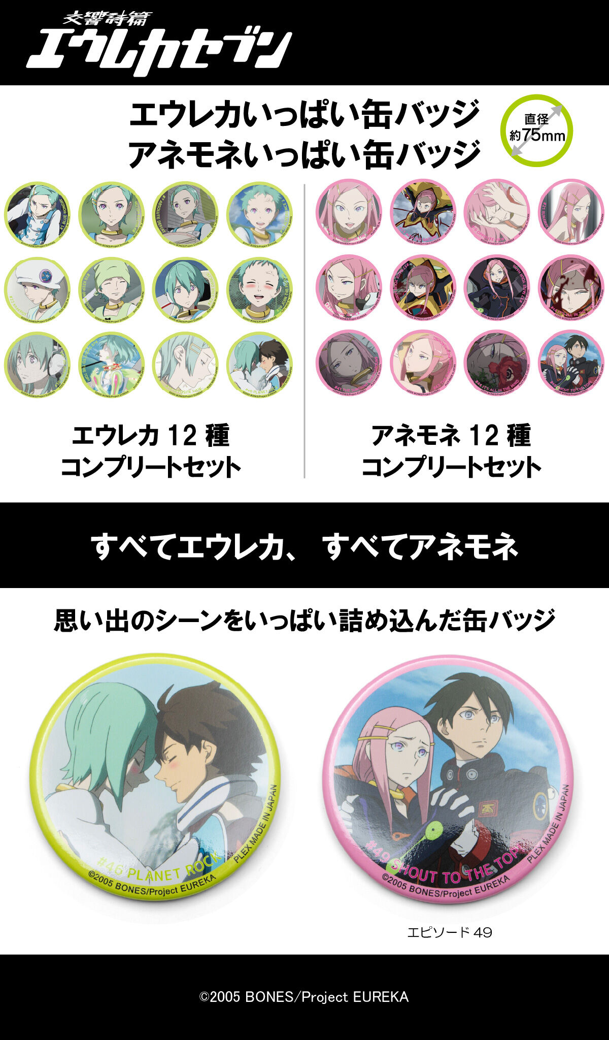交響詩篇エウレカセブンの場面写を使用した直径75mmの缶バッジです。エウレカ、アネモネの厳選したシーンを各キャラクター12種をコンプリートセットにしました。
