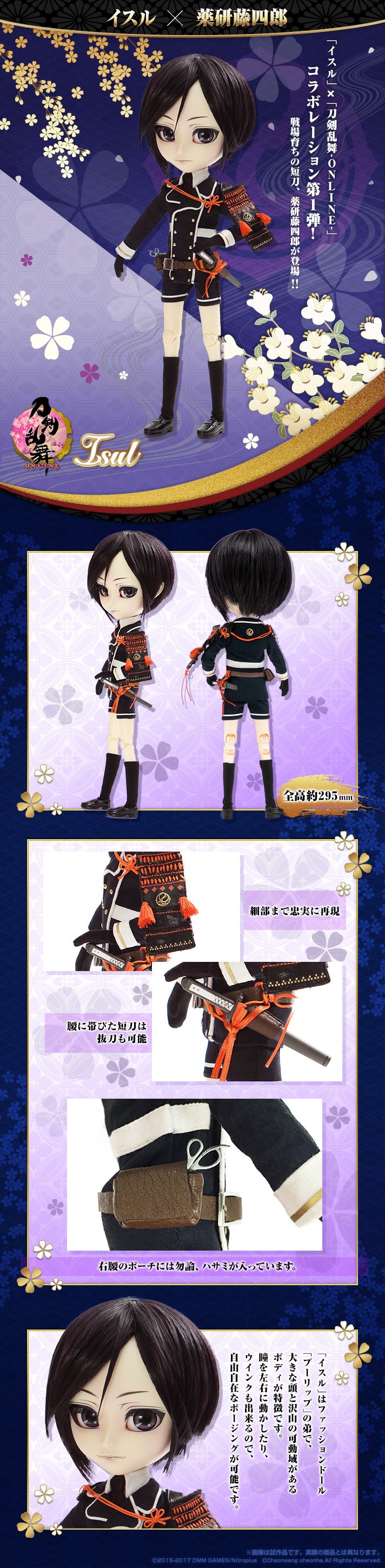 戦場育ちの短刀、薬研藤四郎が登場!! 全高295mm、腰に帯びた短刀は抜刀も可能! 細部まで忠実に再現、右腰のポーチには勿論、ハサミが入っています。「イスル」はファッションドール「プーリップ」の弟で大きな頭と沢山の可動域がある ボディが特徴です。瞳を動かしたり、ウインクも出来るので、自由自在なポージングが可能です。 【セット内容】 ドール本体/短刀/制服上着/肩甲/制服パンツ/靴/靴下/ポーチ/ハサミ/ドールスタンド/ 【製品素材】 【対象年齢】 【サイズ】 【生産国】 【ご注文受付数】 【企画】 |