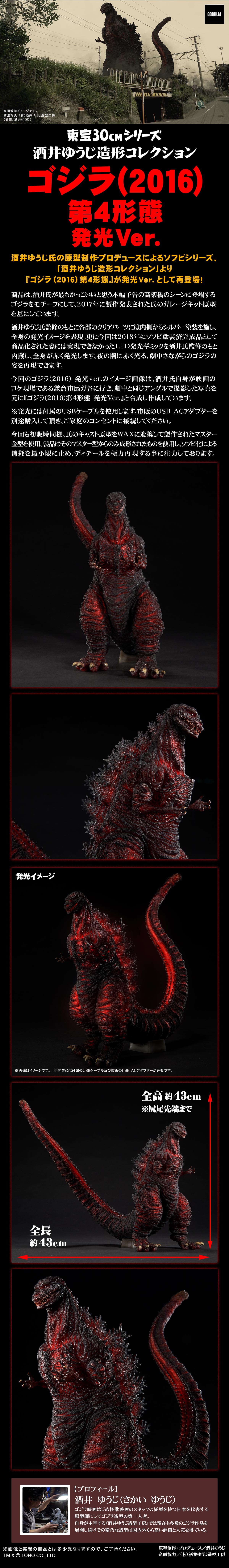 酒井ゆうじ氏の原型制作・プロデュースによるソフビシリーズ、「酒井ゆうじ造形コレクション」より『ゴジラ(2016)第4形態 』が発光Ver.として再登場!