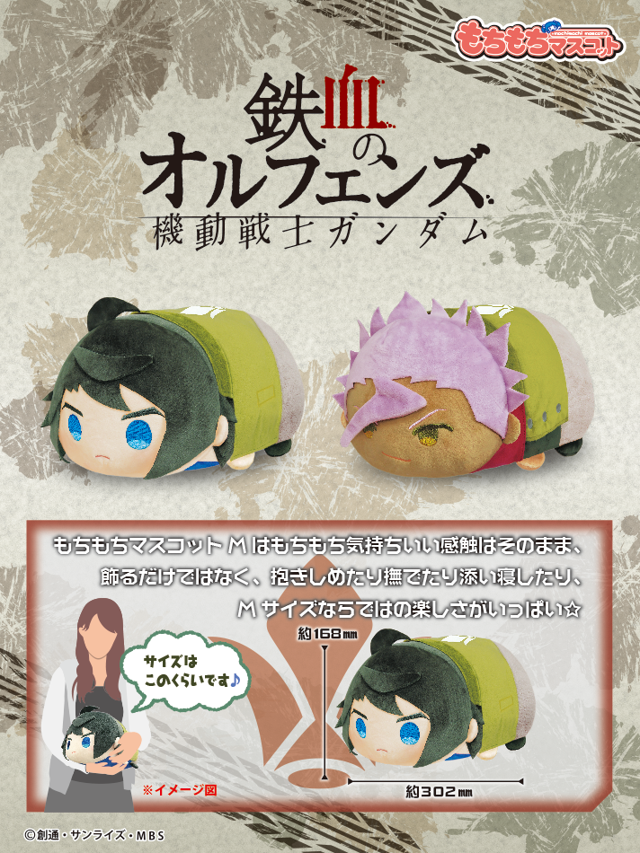 本商品は、2016年10月2日より第2期が放送開始したTVアニメ「機動戦士ガンダム 鉄血のオルフェンズ」のキャラクターを可愛くディフォルメした「もちもちマスコットシリーズ」を、全長約30cmのMサイズにした大きなぬいぐるみです。