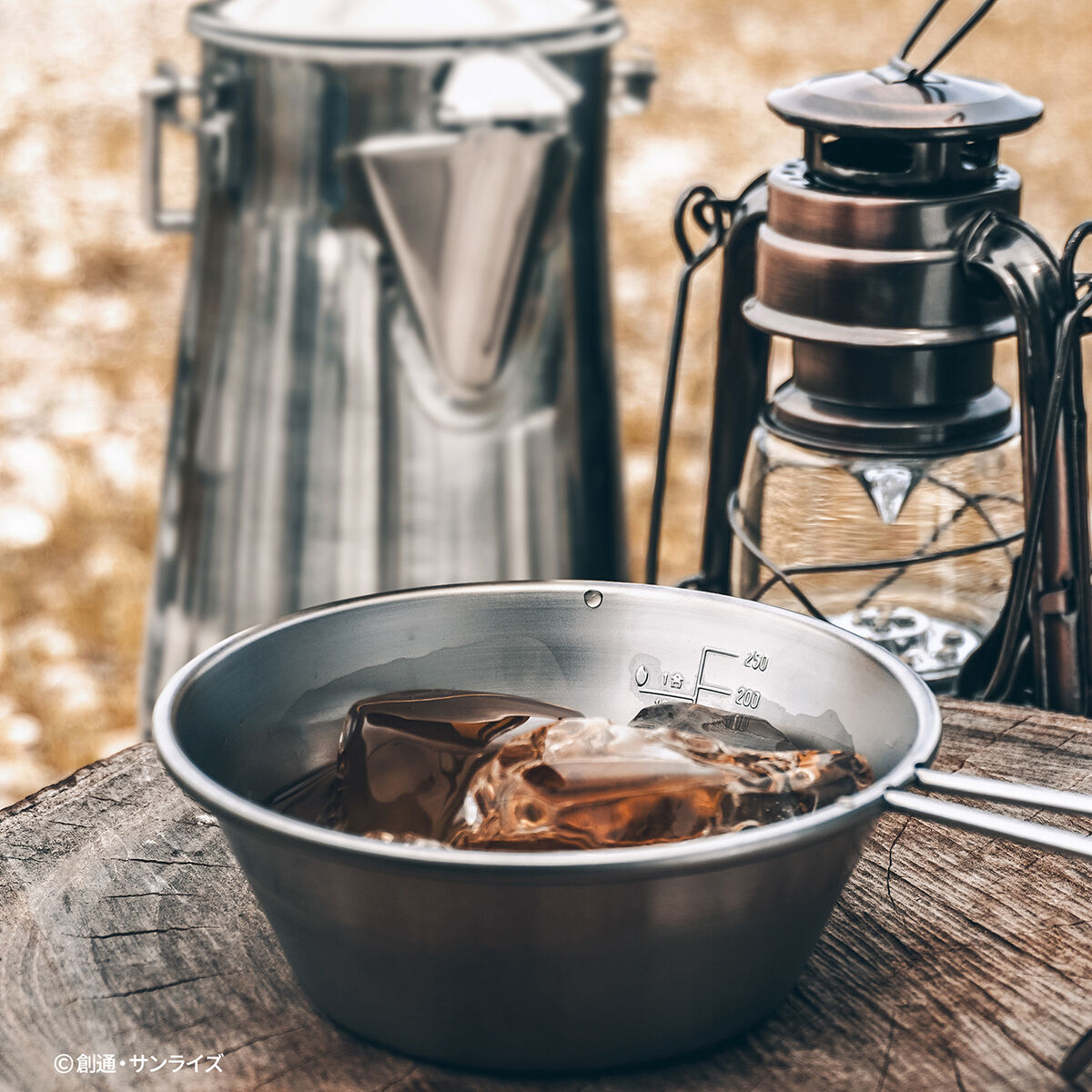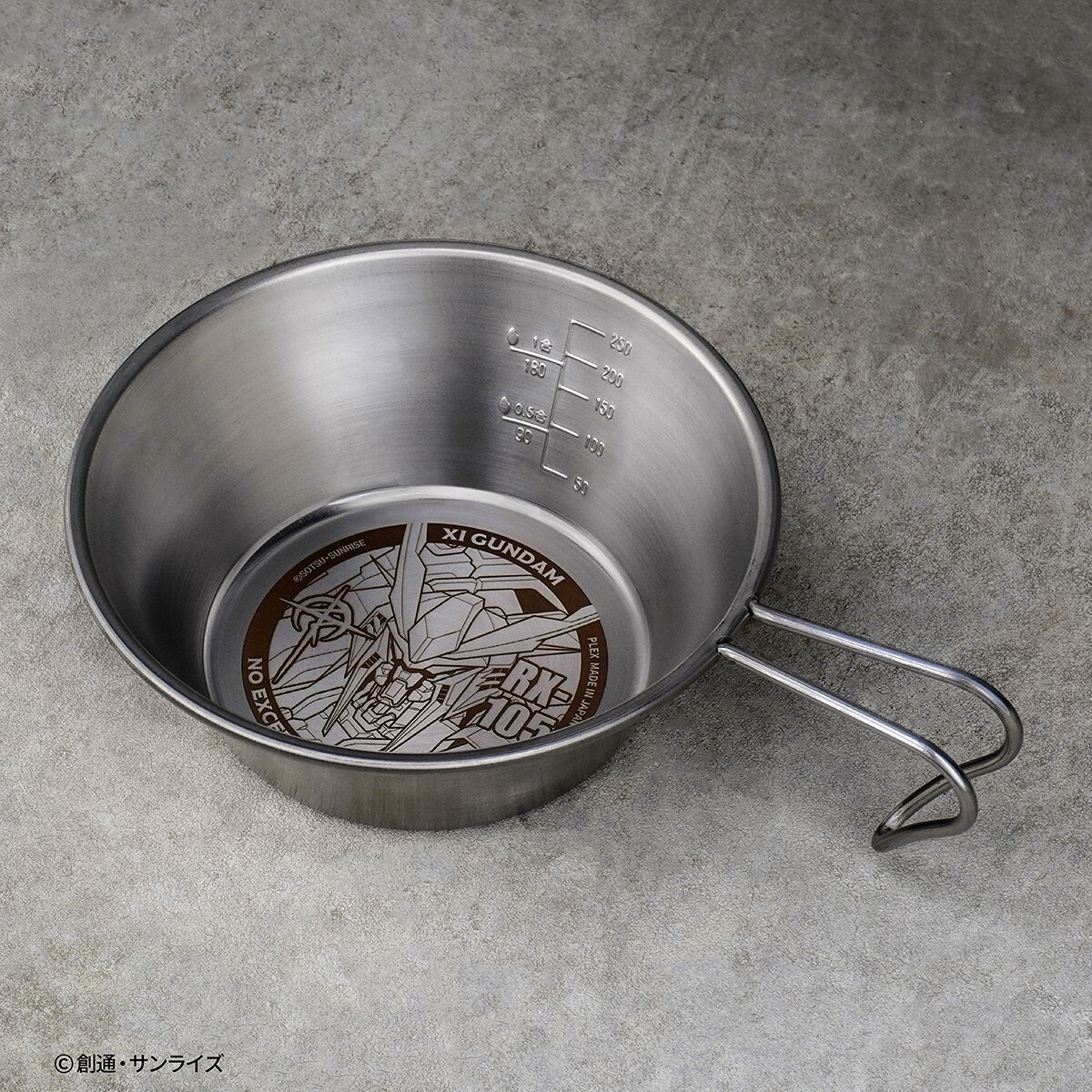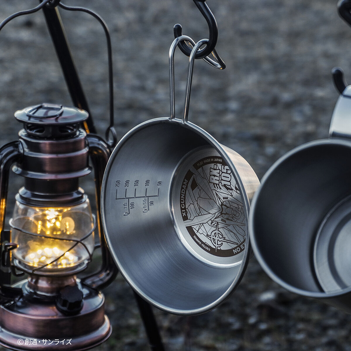 『機動戦士ガンダム 閃光のハサウェイ キルケーの魔女』に登場するモビルスーツ「Ξガンダム」をモチーフにしたデザインを刻印したシェラカップ。ドリンクや料理を注ぐ器として使える広口のステンレス製カップで、火にかけることができるので沸かす・焼く・煮るといった調理にも使用できる便利なアイテムです。