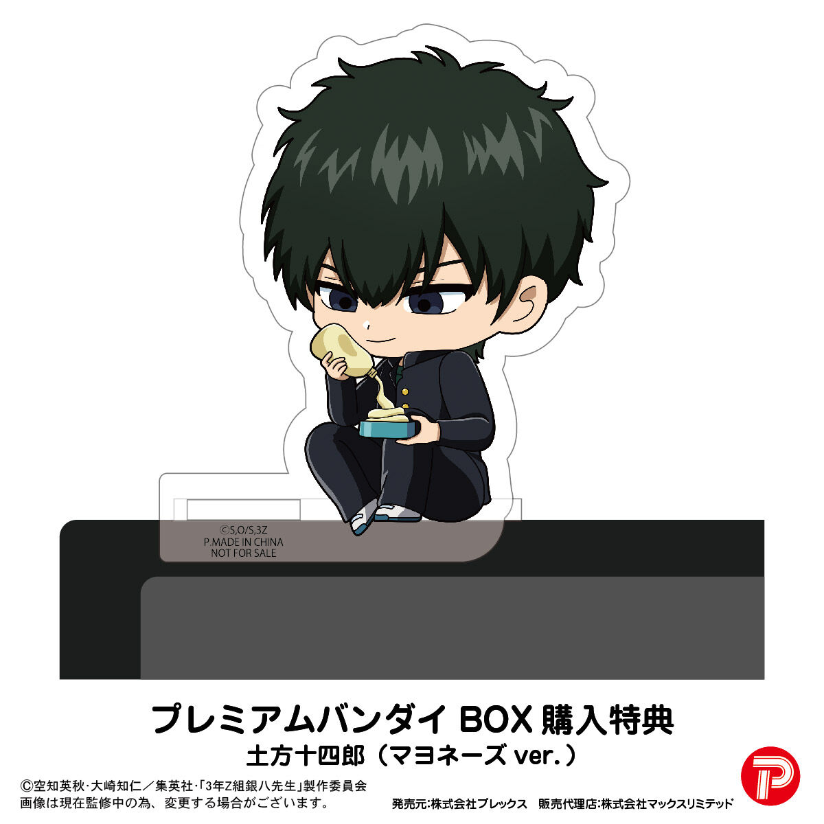 色々な場所の「カド」に座ったり、ぶら下がったり、もたれたり。。。 ディフォルメされたキャラクターを様々なシチュエーションで飾ることができる、新しいタイプのアクリルスタンド 【3年Z組銀八先生 カドキャラ】が新登場! プレミアムバンダイでBOX購入していただくと、購入特典として【土方十四郎(マヨネーズver.)】が付属します! 【商品名】3年Z組銀八先生 カドキャラ <ラインナップ> 坂田銀八/志村新八/神楽/土方十四郎/沖田総悟/桂小太郎/高杉晋助/神威 ※1BOXで全種揃います。 <プレミアムバンダイ BOX購入特典> 土方十四郎(マヨネーズver.) 【価格】7,040円(税込)※BOX単位での販売となります。 【種類数】全8種 【本体サイズ】約80mm(種類によって若干異なります。) 【本体材質】アクリル 【対象年齢】15才以上 【商品の取り扱い】全国ホビー店、アニメ雑貨専門店などでの取り扱いがございます。 ※店頭では単品販売(クローズドボックス)の予定です。 ※プレミアムバンダイ限定特典付きの本商品は26年4月発送予定となりますが、 一部店舗では、26年3月中に店頭に並ぶ場合がございます。 |
