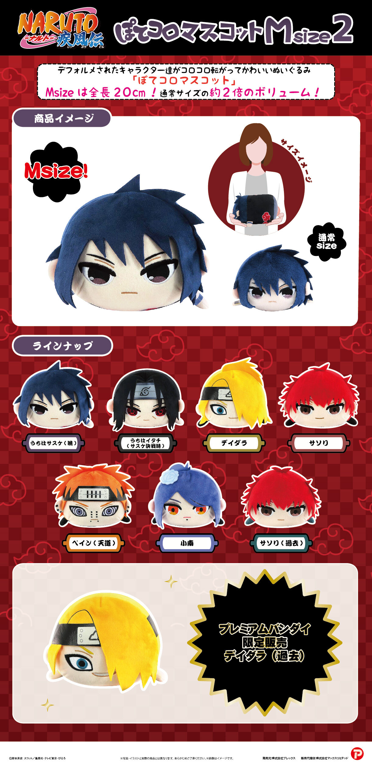 デフォルメされたキャラクター達がコロコロ転がる様な形状の、全長約20cmのぬいぐるみです。 プレミアムバンダイでは限定商品として【デイダラ(過去)】がラインナップ! 【商品名】NARUTO-ナルト- 疾風伝 ぽてコロマスコットMsize2 ※プレミアムバンダイ発送分は25年9月発送予定となりますが、